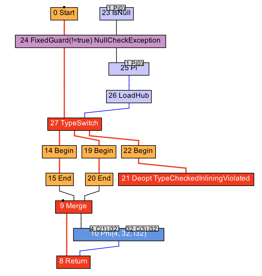 第一,如果类型Profile是完整的,也就是说,所有出现过的动态类型都被记录至类型Profile之中,那么即时编译器可以让程序进行去优化,重新收集类型Profile,对应的IR图如下所示(这里27号TypeSwitch节点等价于前面伪代码中的多个if语句):