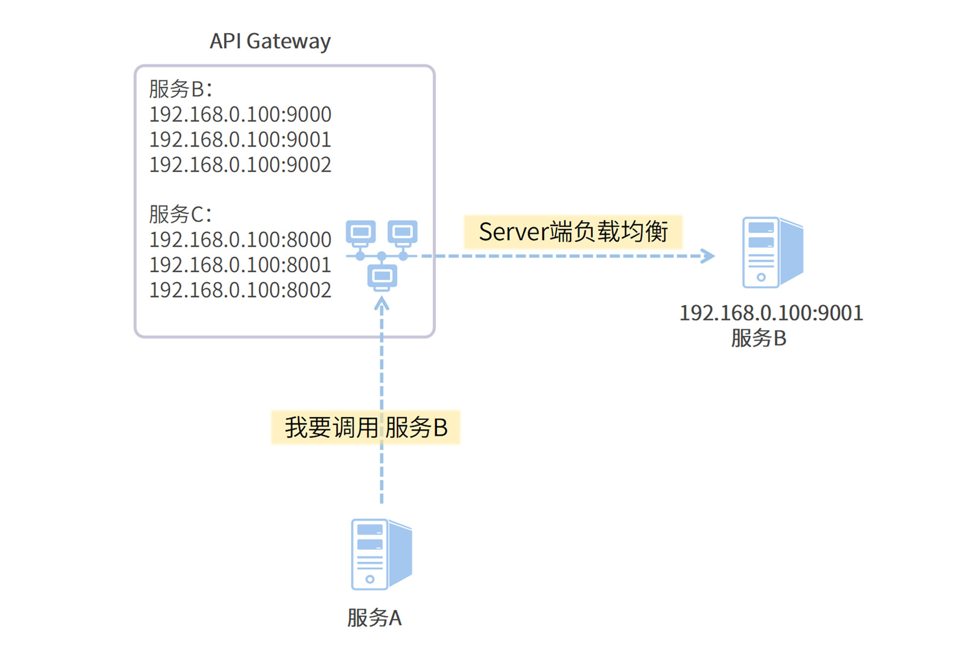 网关层负载均衡也被称为服务端负载均衡,就是在服务集群内设置一个中心化负载均衡器,比如API Gateway服务。发起服务间调用的时候,服务请求并不直接发向目标服务器,而是发给这个全局负载均衡器,它再根据配置的负载均衡策略将请求转发到目标服务。我把这个过程画成了下面这张流程图。