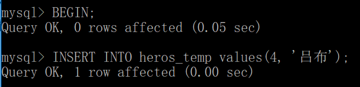我们在客户端2中开启一个事务,在heros_temp表中写入一个新的英雄“吕布”,注意这个时候不要提交。