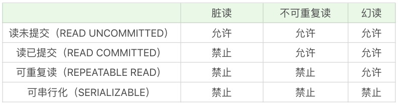 解决异常数量从少到多的顺序(比如读未提交可能存在3种异常,可串行化则不会存在这些异常)决定了隔离级别的高低,这四种隔离级别从低到高分别是:读未提交(READ UNCOMMITTED )、读已提交(READ COMMITTED)、可重复读(REPEATABLE READ)和可串行化(SERIALIZABLE)。这些隔离级别能解决的异常情况如下表所示: