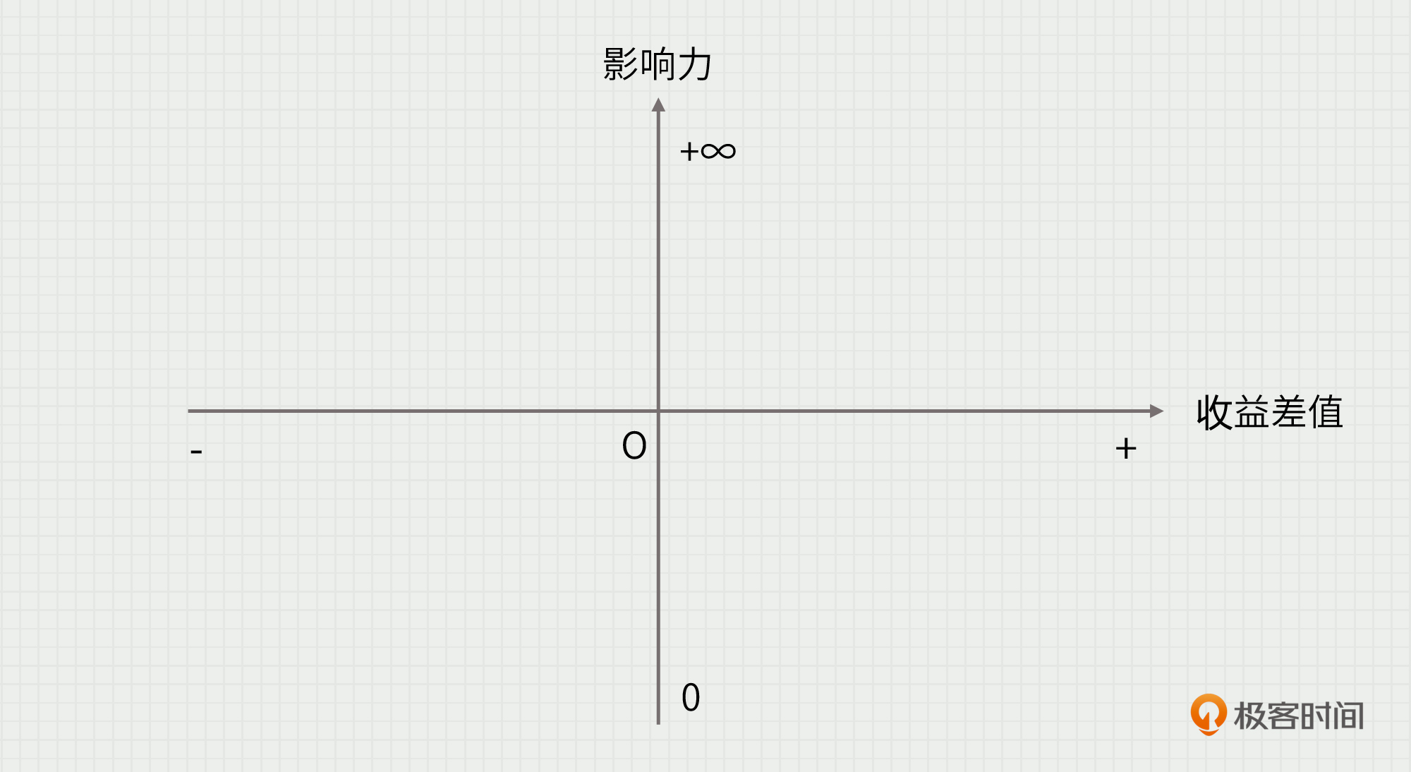 纵轴代表影响力,是指某个角色在整个用户生态所有角色中的影响力,即他的话语权大小。纵轴的最下方为 0,最上方为正无穷。横轴代表收益,是一个“收益差值”,是产品从无到有,用户的收益变化。横轴的左边为负,右边为正。
