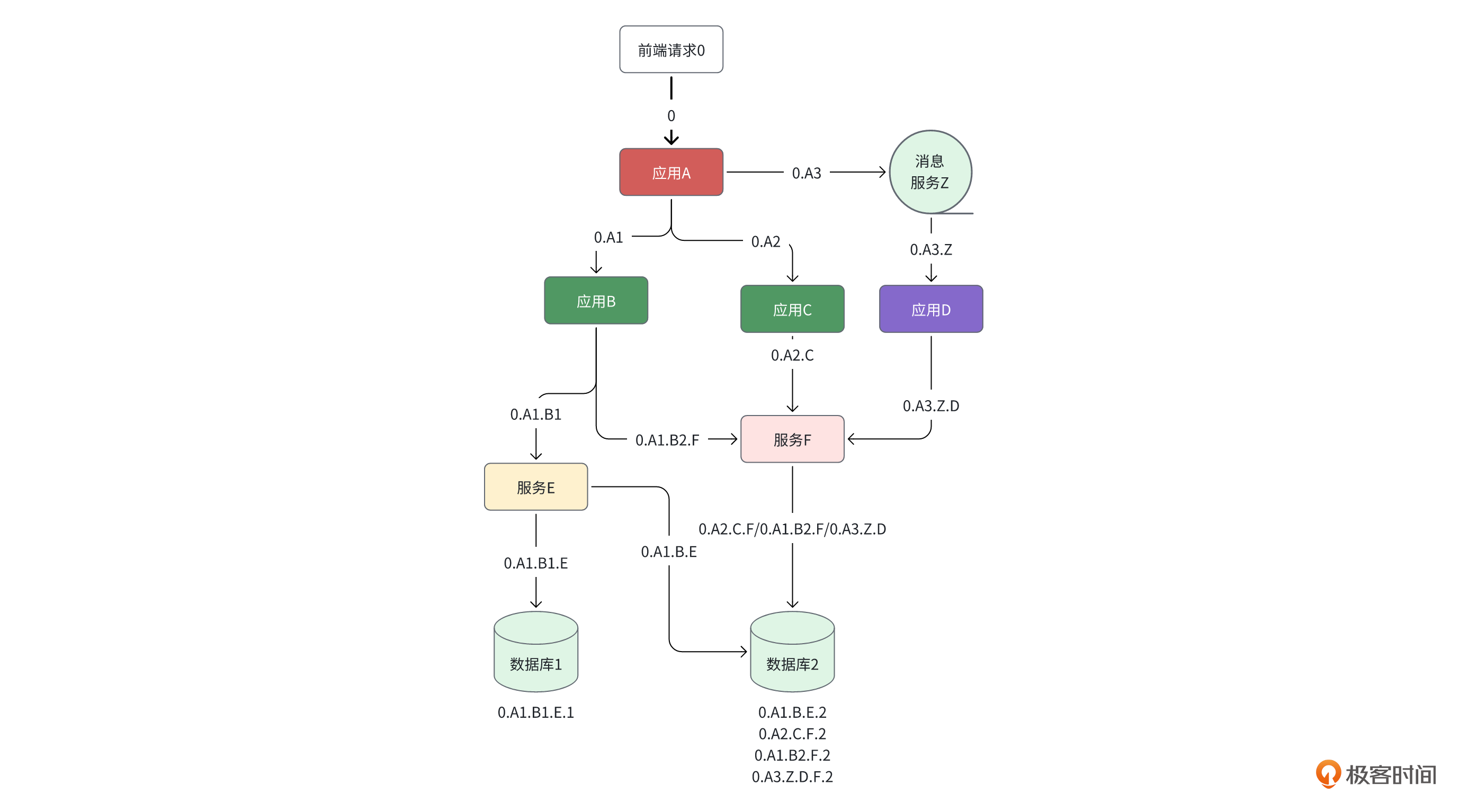 在这样一个复杂的链路体系里,几乎每一个前端页面的请求都会形成一套复杂的分布式服务调用链路。例如0.A3.Z.D.F.2,就经过了“应用-消息服务-应用-数据库”这么一长串链路。如果要真正理解不同架构系统之间的行为关系,就需要在这些应用或系统之间建立具备关联关系的动作。这样,在发生线上故障的时候,就能快速定位、解决问题了。