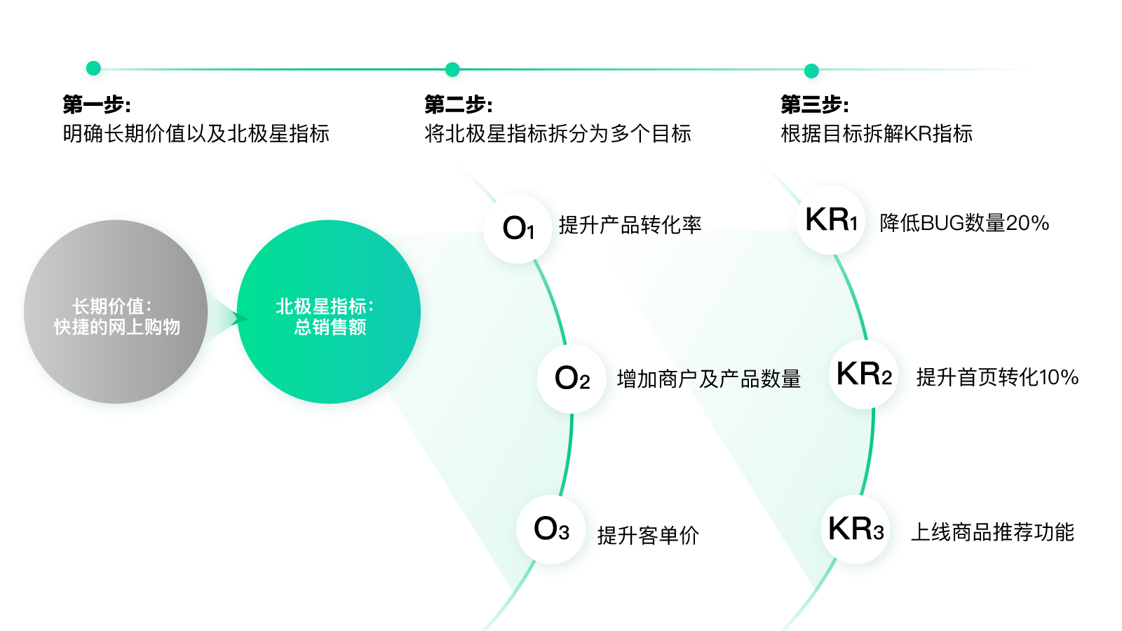 举个例子,假设你现在的公司是一家电商公司,你应该如何通过OKR助力增长呢?你可以分三步走。