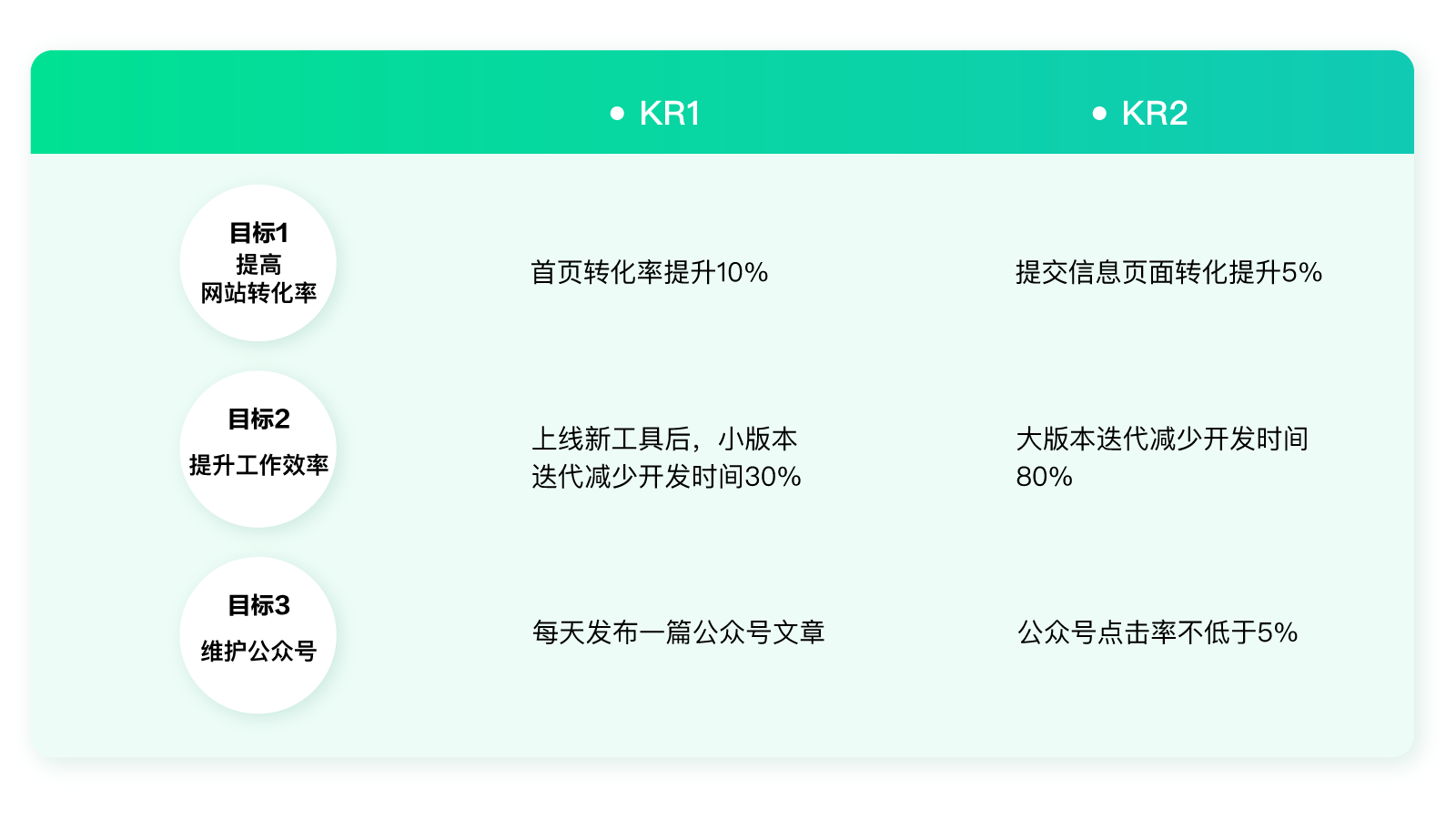 在目标与关键成果法中,每个目标(O)后面都可以跟着数个关键成果(KR),我们可以把这些关键成果标记为KR1、KR2……
