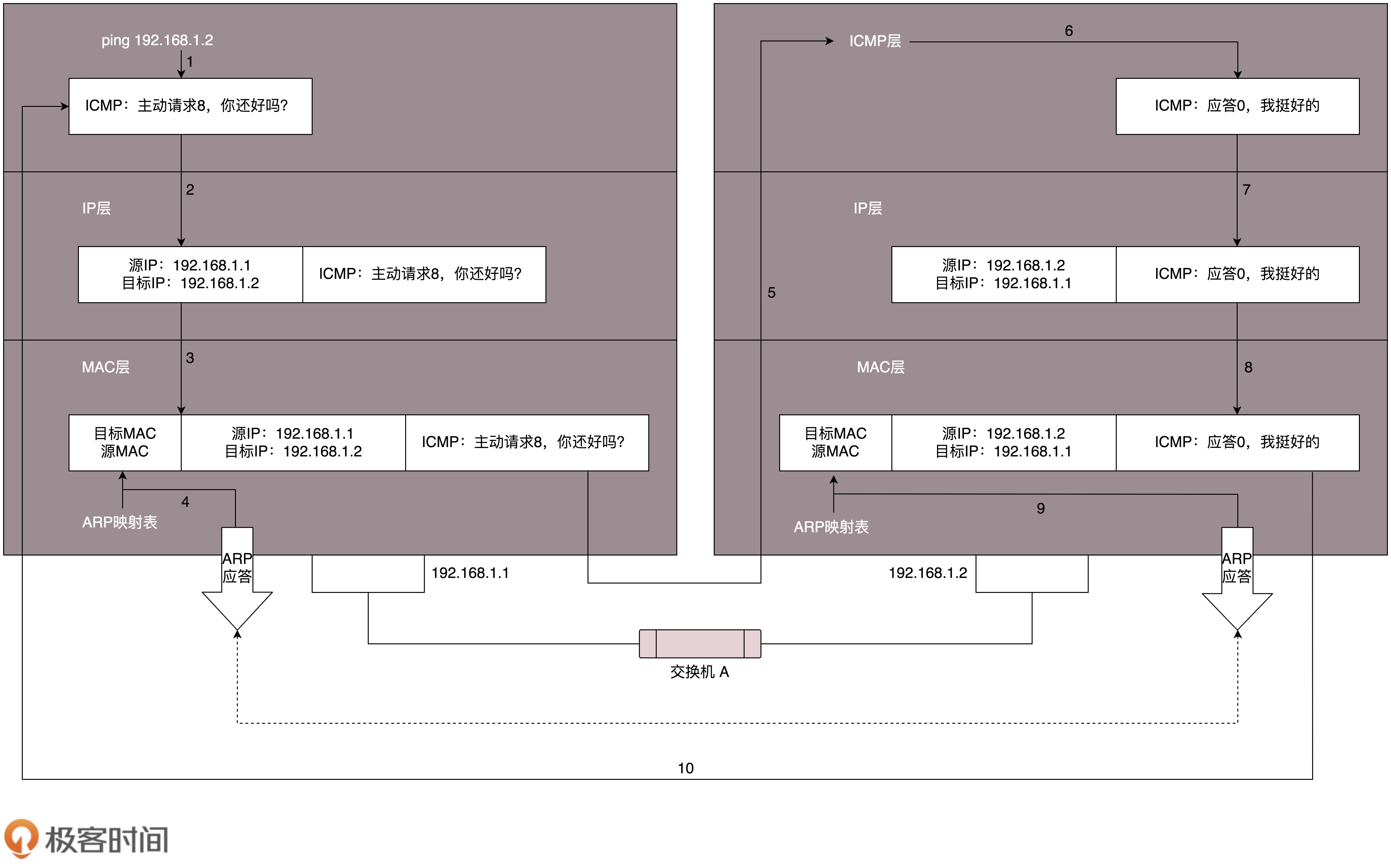 假定主机A的IP地址是192.168.1.1,主机B的IP地址是192.168.1.2,它们都在同一个子网。那当你在主机A上运行“ping 192.168.1.2”后,会发生什么呢?