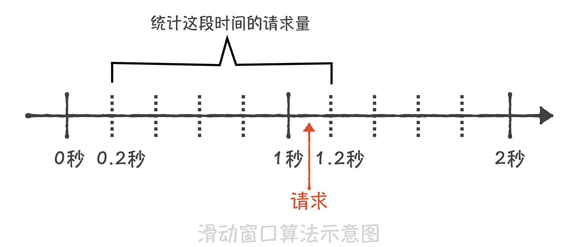 为了解决这个缺陷,就有了基于滑动窗口的算法。 这个算法的原理是将时间的窗口划分为多个小窗口,每个小窗口中都有单独的请求计数。比如下面这张图,我们将1s的时间窗口划分为5份,每一份就是200ms;那么当在1s和1.2s之间来了一次新的请求时,我们就需要统计之前的一秒钟内的请求量,也就是0.2s~1.2s这个区间的总请求量,如果请求量超过了限流阈值那么就执行限流策略。