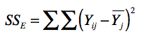 在这个公式中,$n_{j}$为水平$j$下的观测数量,在我们的案例中为10。$\overline Y_{j}$为第$j$个水平的平均值,在案例中为算法a或算法b在这10天的平均值。$\overline Y_{j}-\overline{\overline Y}$表示的是某个算法的采样均值和所有采样均值之间的差异,$n_{j}$是相应的权重。我们这里的两个算法都被测试了10天,所以权重相同。根据我们的案例,SSM是0.00018。SSE表示采样引起的方差,我们称它为误差平方和(Sum of Squaress for Error)。它的计算公式如下: