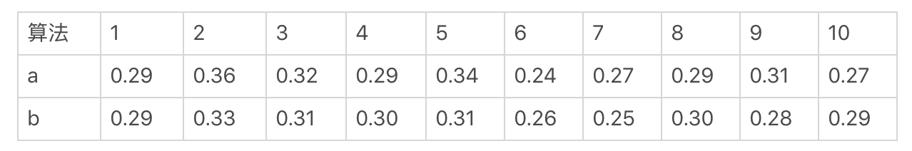 我们假设只有两种算法a和b参与了A/B测试。为了检验这些算法导致的转化率,是不是存在显著的差异,我们进行一个为期10天的测试,每天都为每种算法获取一个转化率。具体的数据我列在下面这张表格中。