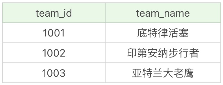 team_score表为球队比赛成绩表,一共记录了两场比赛的成绩,如下所示: