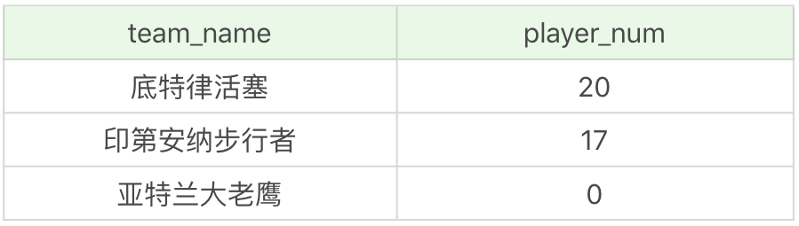 你能看到,在player表中只有底特律活塞和印第安纳步行者的球员数据,所以它们的player_num不为0,而亚特兰大老鹰的player_num等于0。在查询的时候,我将子查询SELECT count(*) FROM player WHERE player.team_id = team.team_id作为了计算字段,通常我们需要给这个计算字段起一个别名,这里我用的是player_num,因为子查询的语句比较长,使用别名更容易理解。