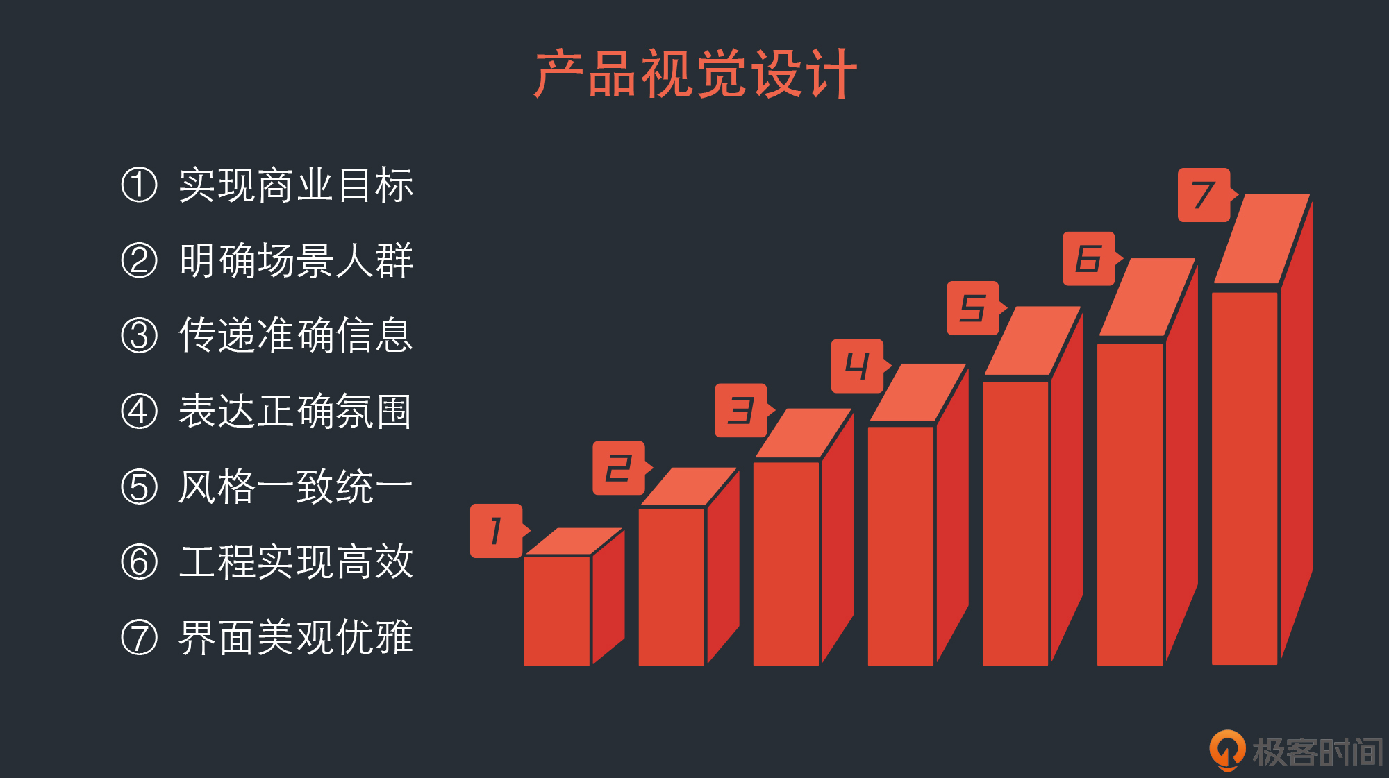 今天我给你讲解了产品视觉设计的七个关键步骤:实现商业目标、明确场景人群、传递准确信息、表达正确氛围、风格一致统一、工程实现高效、界面美观优雅。