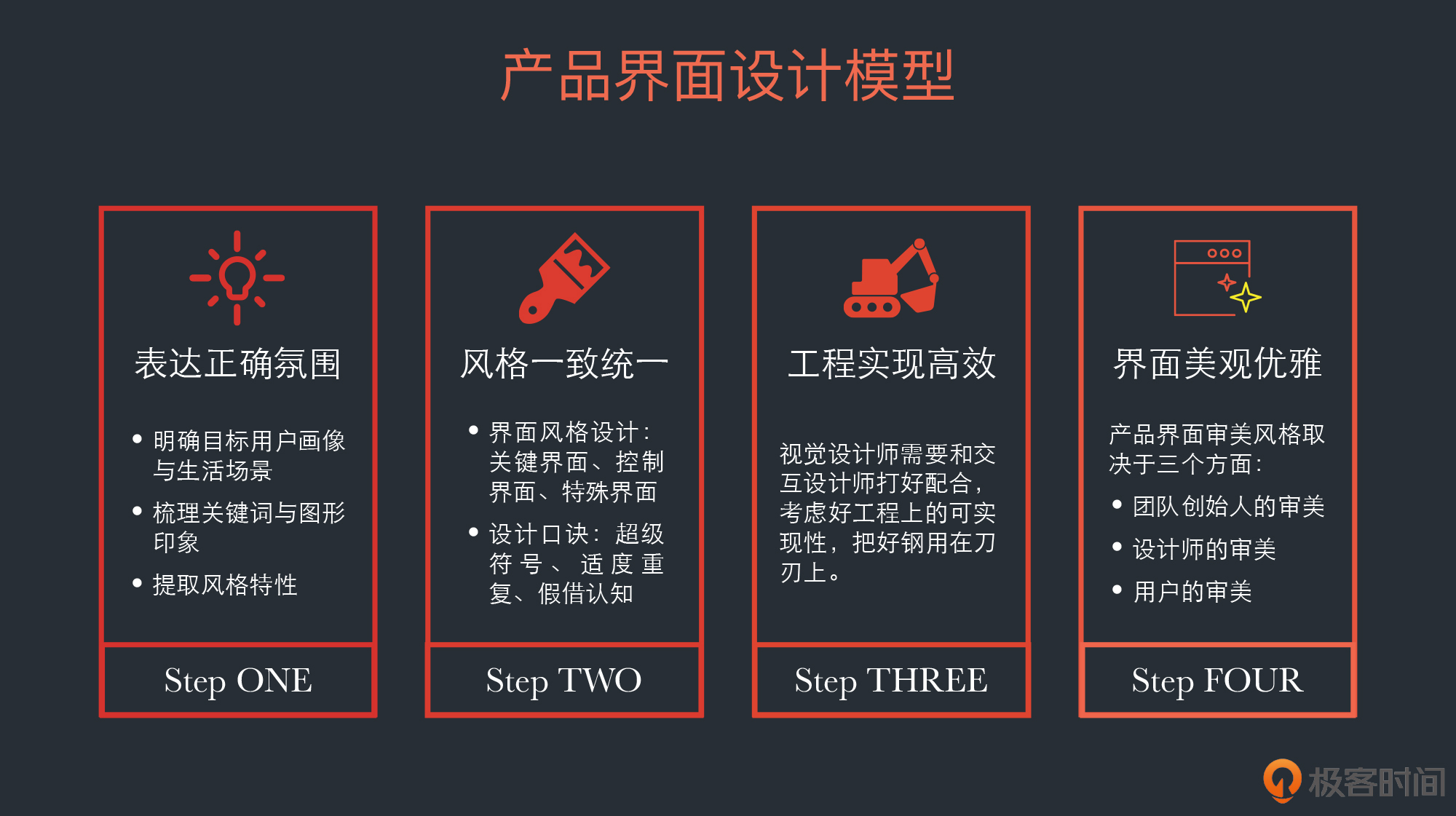 好,到此为止,我就介绍完了一个产品GUI设计的流程和方法。最后我们来总结一下今天所讲的内容吧。