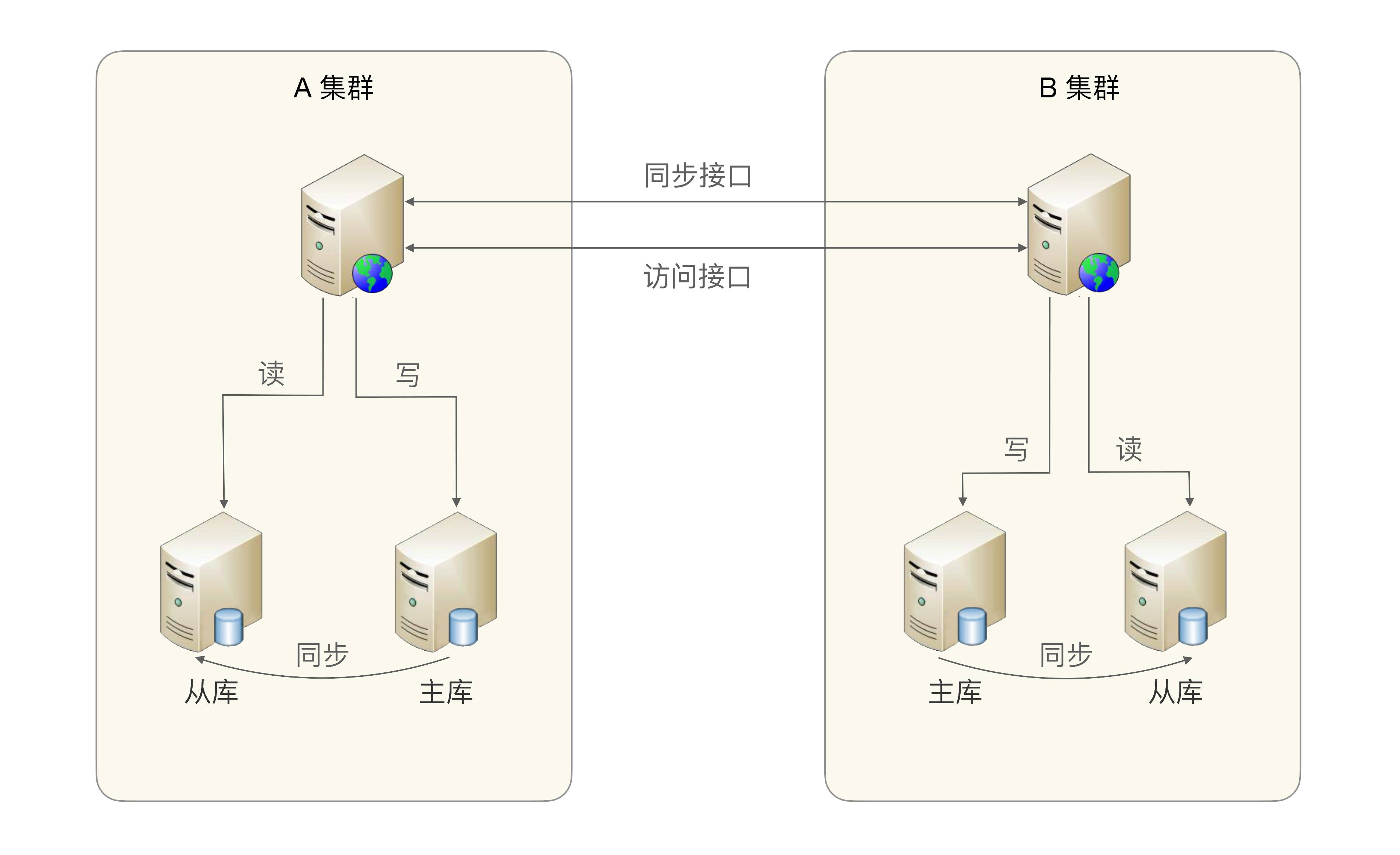 S系统是游戏接入的核心系统,一旦S系统故障,大量游戏玩家就不能登录游戏。而S系统并不具备多中心的能力,一旦主机房宕机,整个S系统业务就不可用了。其大概架构如下图所示,可以看出数据库主库是全局单点,一旦数据库主库不可用,两个集群的写业务都不可用了。