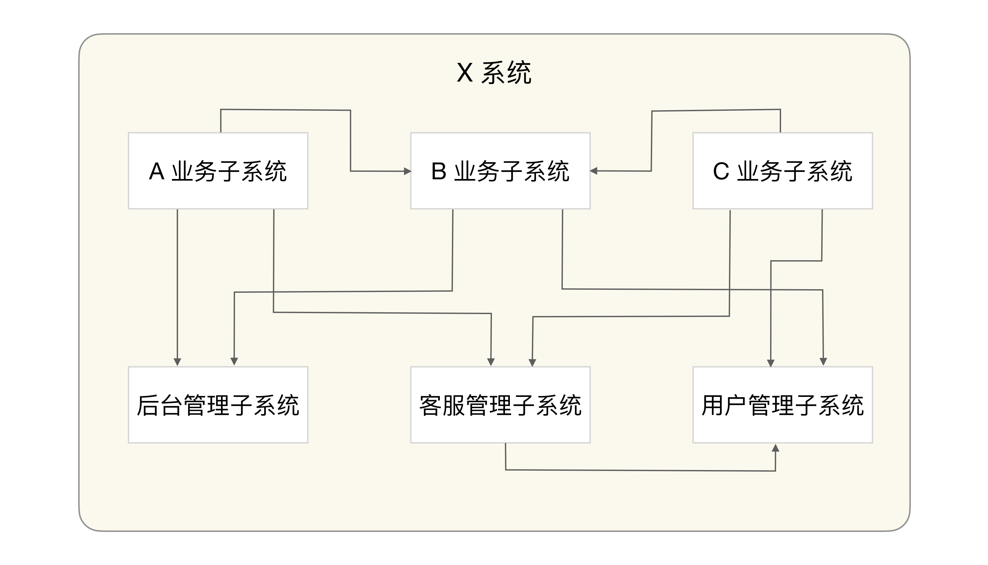 针对X系统存在的问题,重构目标是将各个功能拆分到不同的子系统中,降低单个系统的复杂度。重构后的架构如下图所示(仅仅是示例,实际架构远比下图复杂):
