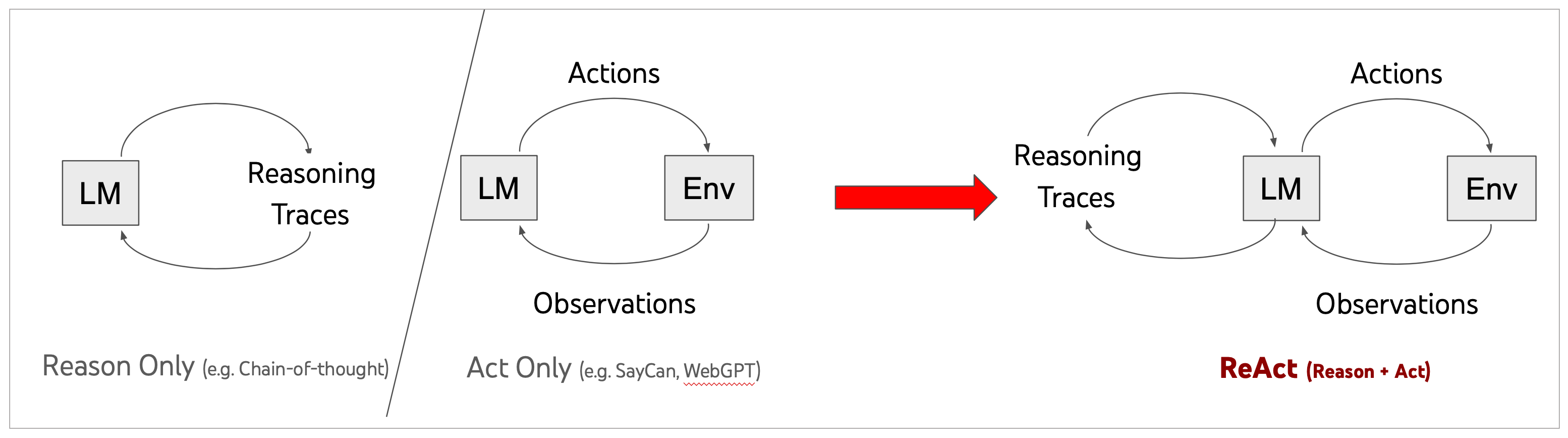 - 在行动阶段,模型会采取下一步的行动,如与外部源(如知识库或环境)进行交互并收集信息,或给出最终答案。