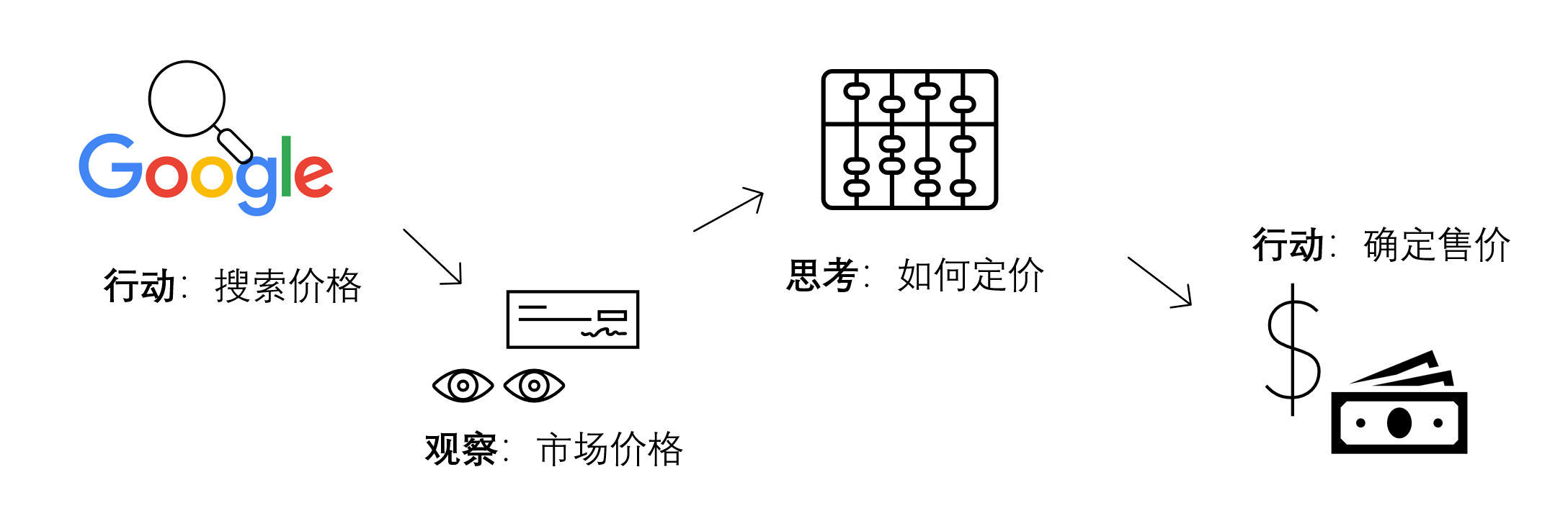 也许你会告诉我,我会去Google上面查一查今天的鲜花成本价啊(行动),也就是我预计的进货的价格,然后我会根据这个价格的高低(观察),来确定我要加价多少(思考),最后计算出一个售价(行动)!