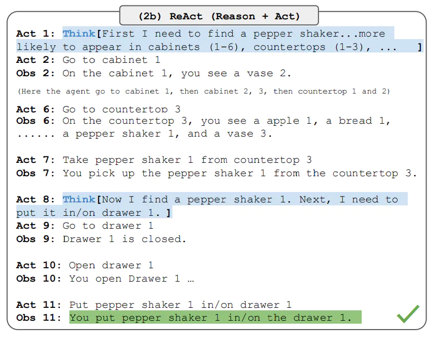 在这个任务中,没有推理能力的模型不能够在房间的各个角落中进行寻找,或者在找到胡椒瓶之后不能够判断下一步的行动,因而无法完成任务。如果使用ReAct,这一系列子目标将被具体地捕获在每一个思考过程中。