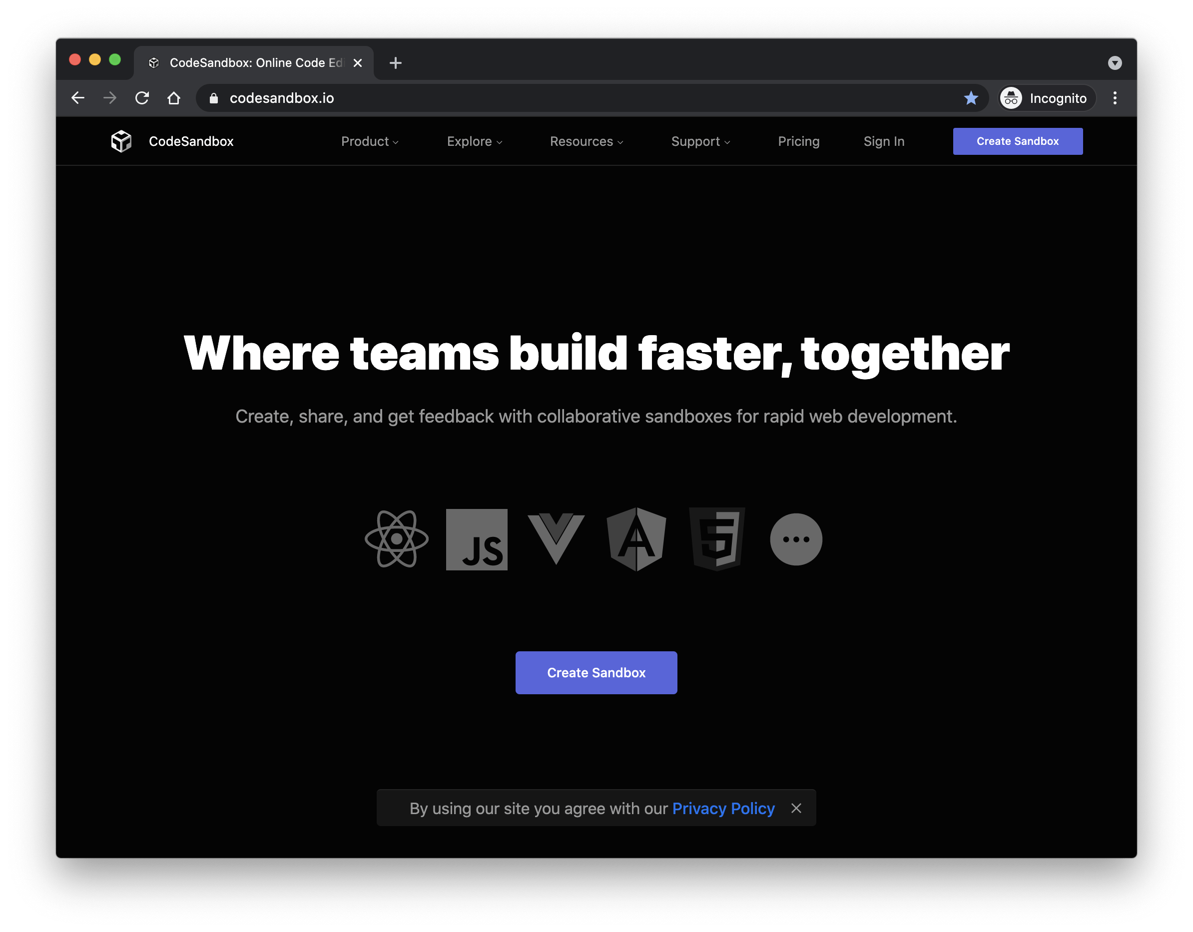 点击 Create Sandbox,就可以创建一个前端的应用。需要说明的是,它不仅支持 React,还能够创建 Angular、Vue 等前端框架的应用。