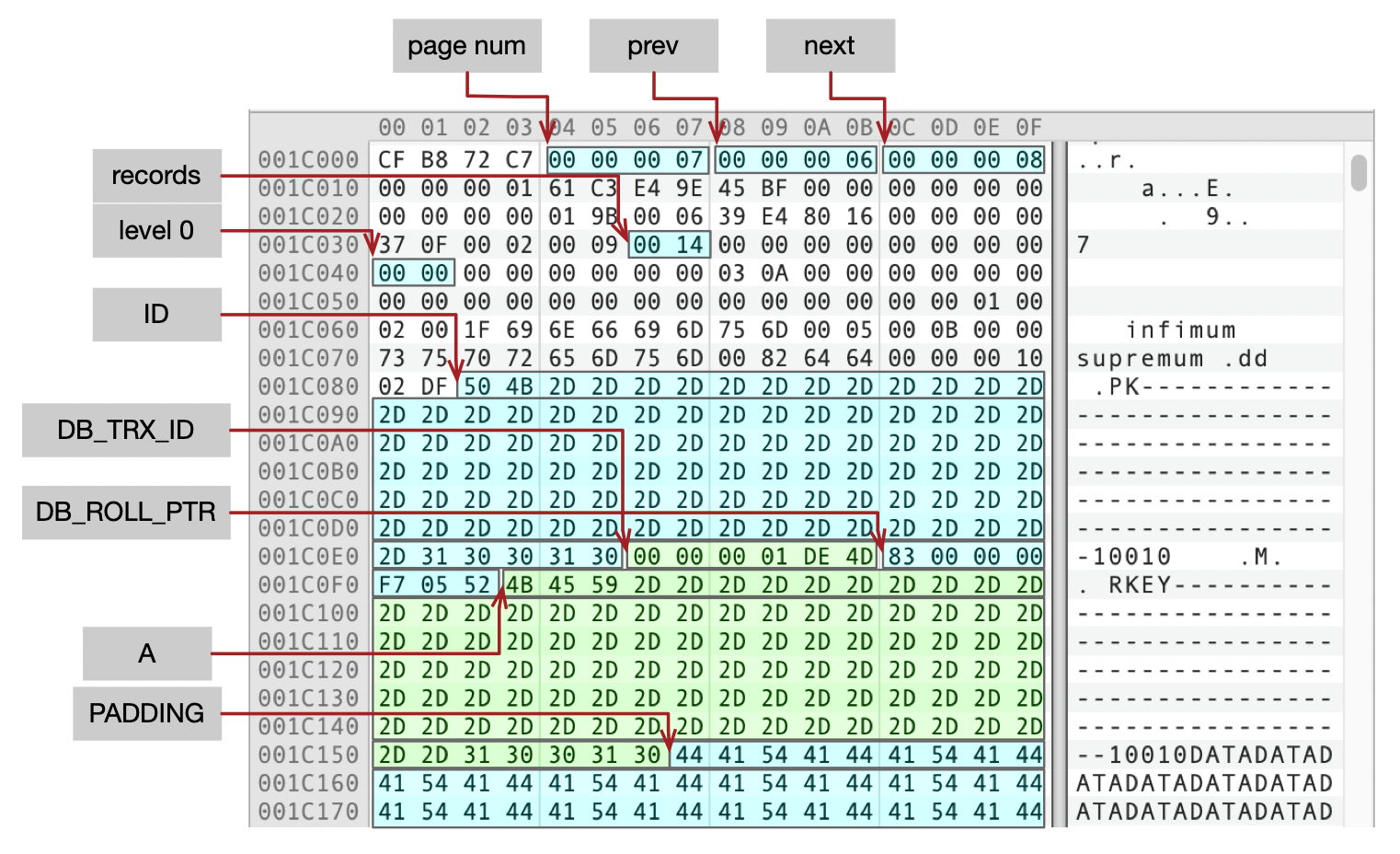 - 每行数据的字段依次为(ID,DB_TRX_ID,DB_ROLL_PTR,A,PADDING),和我们从数据字典中查到的一样。
