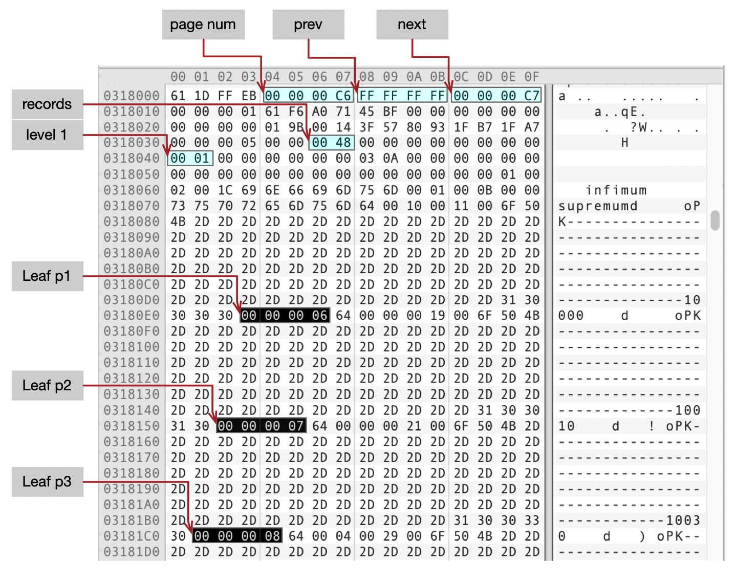 - leaf inode和interior inode分别记录了叶子页面和分支页面所在段(Segment)的段描述符(inode)的地址。inode的作用稍后再介绍。