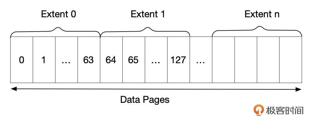 数据文件有固定的格式,每个数据文件被分割为固定大小的页(Page),相邻的页组成区(Extent)。表和索引的数据通过段(Segment)来组织,每个段由一些页和区组成。
