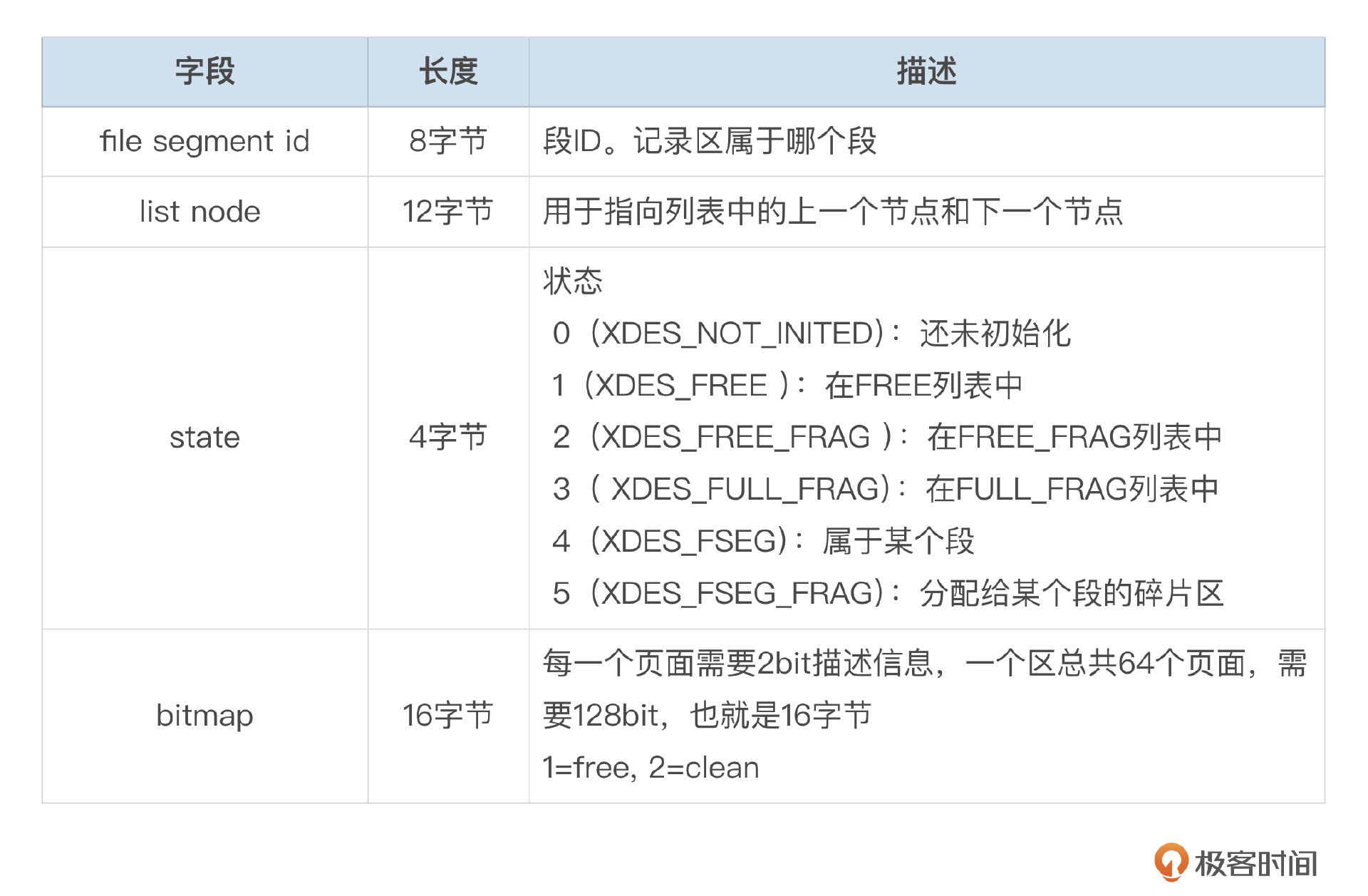 区描述符记录了区的使用情况。数据文件中每一个区都有一个对应的区描述符(XDES)。每一个区描述符占用40字节,具体信息可以参考下面这个表格。