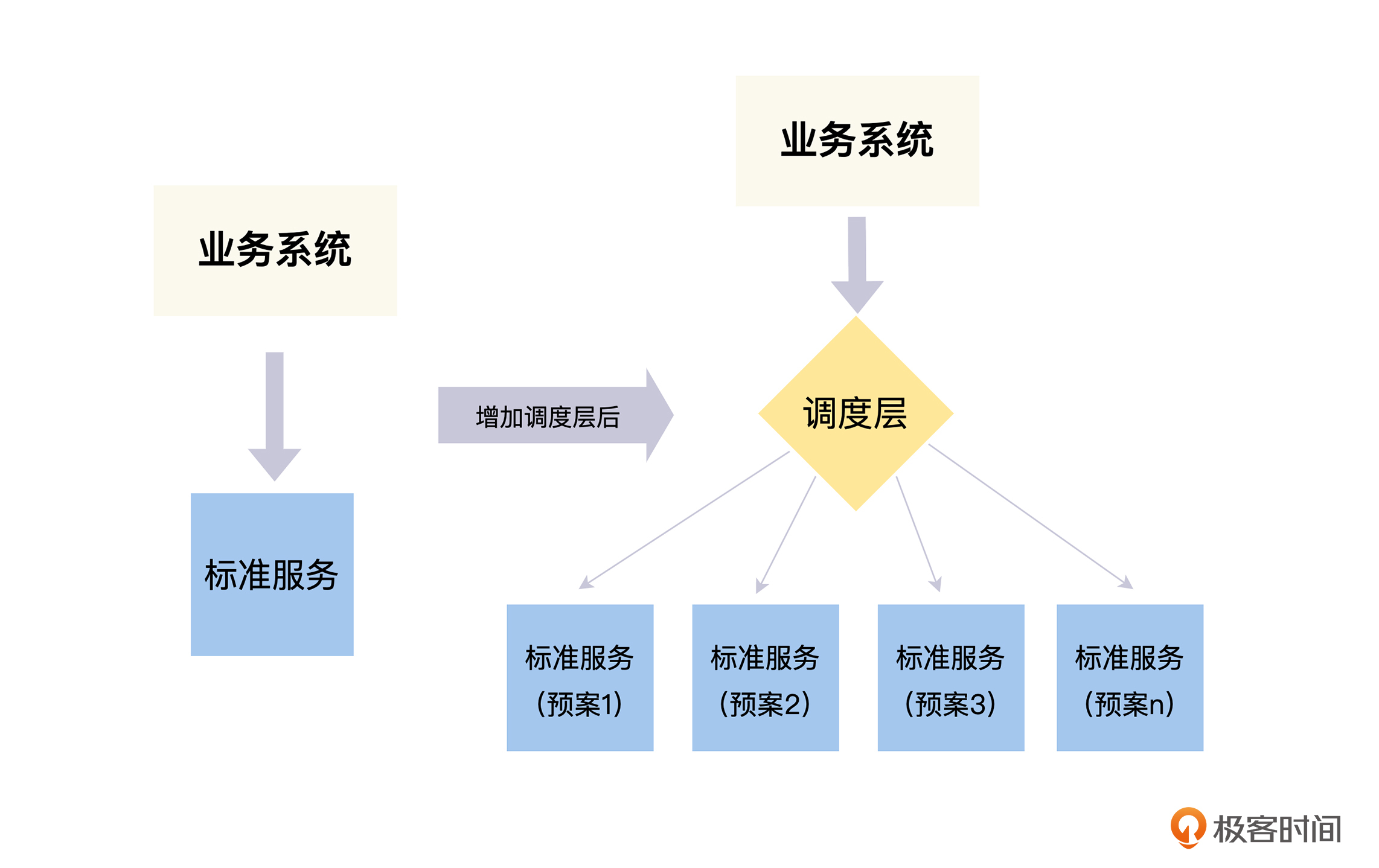 通过上面的例子,我们将预案调度的思路总结为下图。之前,我们的业务系统直接调用标准服务,在增加调度层之后,业务系统直接调用调度层,不需要关心具体的标准服务(即预案)。所以我们可以通过增加调度层的方式,来屏蔽各种预案之间的差异,并且可以在不同的预案之间进行自动最优的调度。