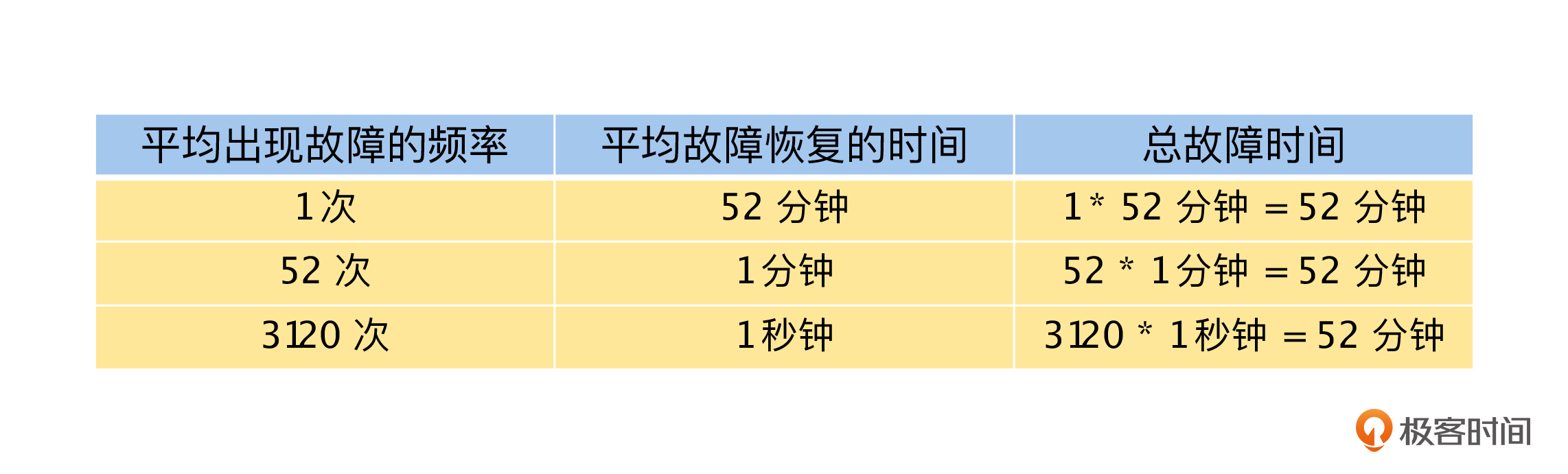 如果是 52 个持续 1 分钟的故障,那么用户会明确感知到系统出现故障。而如果是 1 次 52 分钟的故障,那么故障期间,所有的用户都不能使用系统提供的服务,其中的损失和影响是无法估计的。当然,这里并不是说平均出现故障频率这个指标不重要,如果频繁出现短暂的故障也会影响到用户的体验。