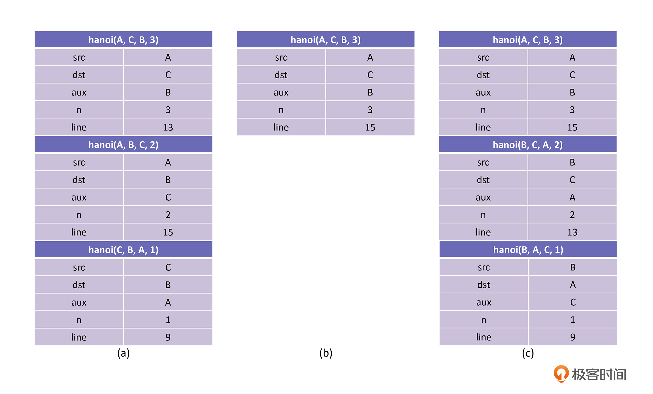 可以看到,当程序在执行hanoi(A, C, B, 3)时,CPU会为其创建一个栈帧,这一帧里记录着变量src、dst、aux和n。