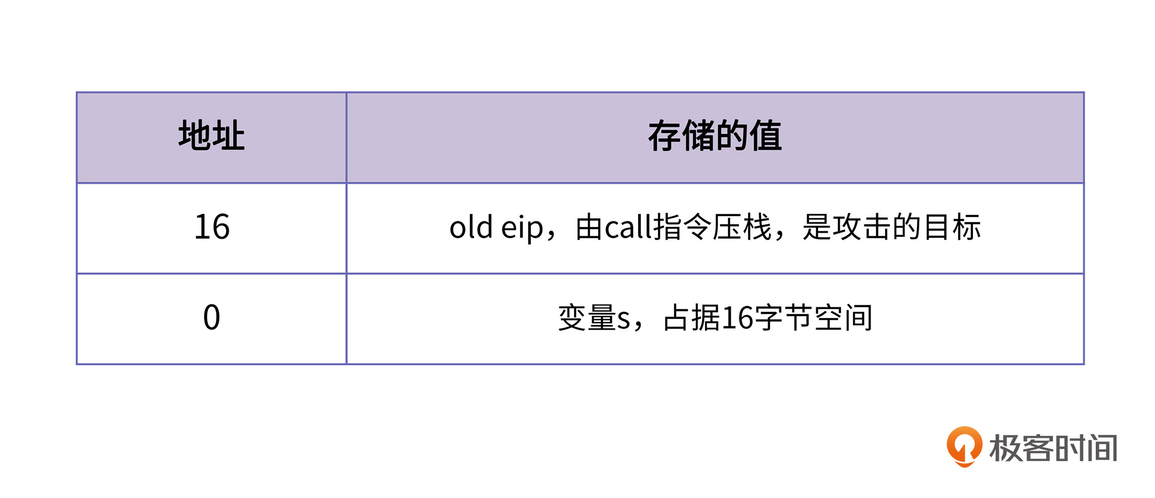 到这里,我们已经从人的大脑的理解角度和机器指令的角度,让你加深了对栈和栈帧的理解。现在,我们就从理论转向实操,举一个通过缓冲区溢出来破坏栈的例子。通过这个例子,你就知道在平时的工作中,应该如何避免写出被黑客攻击的不安全代码。