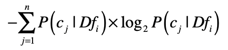 是否属于少数几个类这一点,可以使用信息熵来衡量。我用$Df_{i}$来表示所有出现特征$f_{i}$的数据集合,这个集合一共包含了$n$个分类$C$,而$c_{j}$表示这$n$个分类中的第$j$个。然后我们就可以根据$Df_{i}$中分类$C$的分布,来计算熵。我们用这个公式来计算: