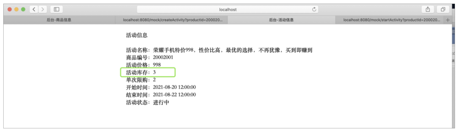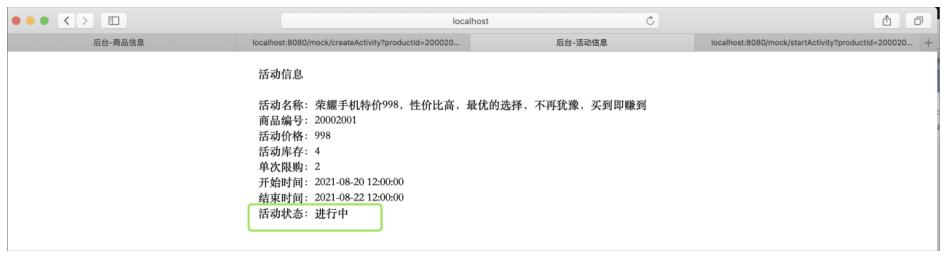 这样活动就触发成功了,这个时候,我们再分别看下活动信息和商品信息,看看都有什么变化: