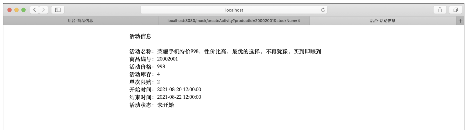 创建完成后,我们调用活动信息查询接口,来查看刚刚创建的活动,页面只是简单地列举了一下活动的主要元素,如下图所示: