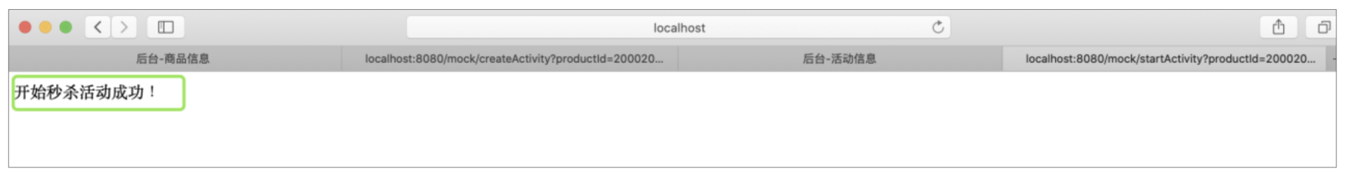 可以看到,活动虽然创建了,但还没有开始,所以这里展示的还是普通商品的名称和价格。下面我们就来手动触发一下,让活动开始,直接调用demo-web的活动开始接口: