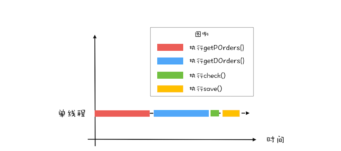 目前的对账系统,由于订单量和派送单量巨大,所以查询未对账订单getPOrders()和查询派送单getDOrders()相对较慢,那有没有办法快速优化一下呢?目前对账系统是单线程执行的,图形化后是下图这个样子。对于串行化的系统,优化性能首先想到的是能否利用多线程并行处理。