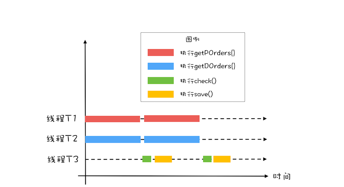 所以,这里你应该能够看出来这个对账系统里的瓶颈:查询未对账订单getPOrders()和查询派送单getDOrders()是否可以并行处理呢?显然是可以的,因为这两个操作并没有先后顺序的依赖。这两个最耗时的操作并行之后,执行过程如下图所示。对比一下单线程的执行示意图,你会发现同等时间里,并行执行的吞吐量近乎单线程的2倍,优化效果还是相对明显的。