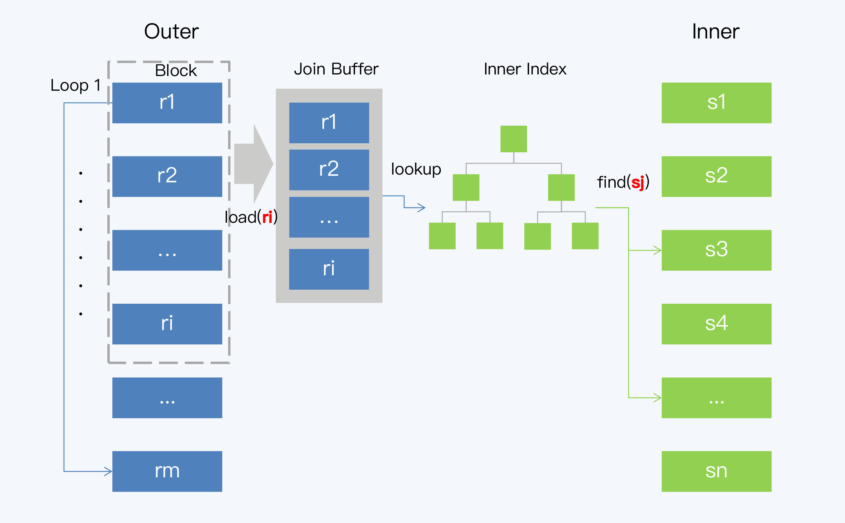 - 通过连接键(Join Key)和ri可以确定对Inner表索引的扫描范围,再通过索引得到对应的若干条数据记录,记为sj;