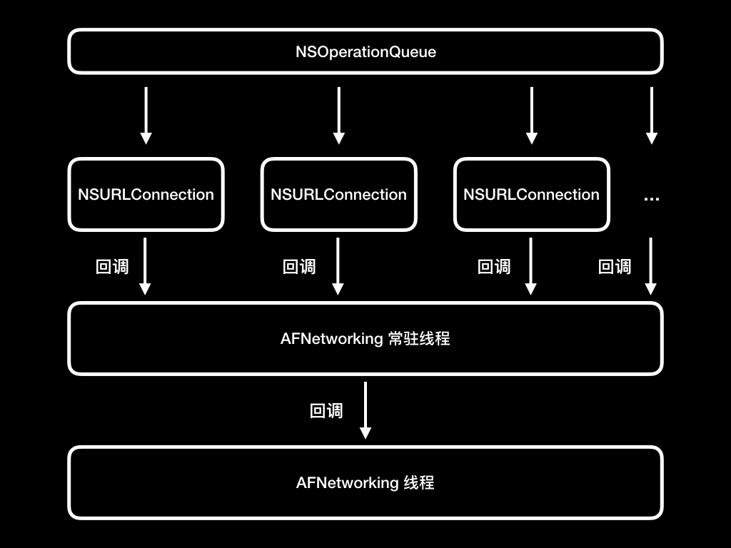 这是因为主线程还要处理大量的UI 和交互工作,为了减少对主线程的影响,所以AFNetworking 2.0 就新建了一个常驻线程,用来处理所有的请求和回调。AFNetworking 2.0的线程设计如下图所示: