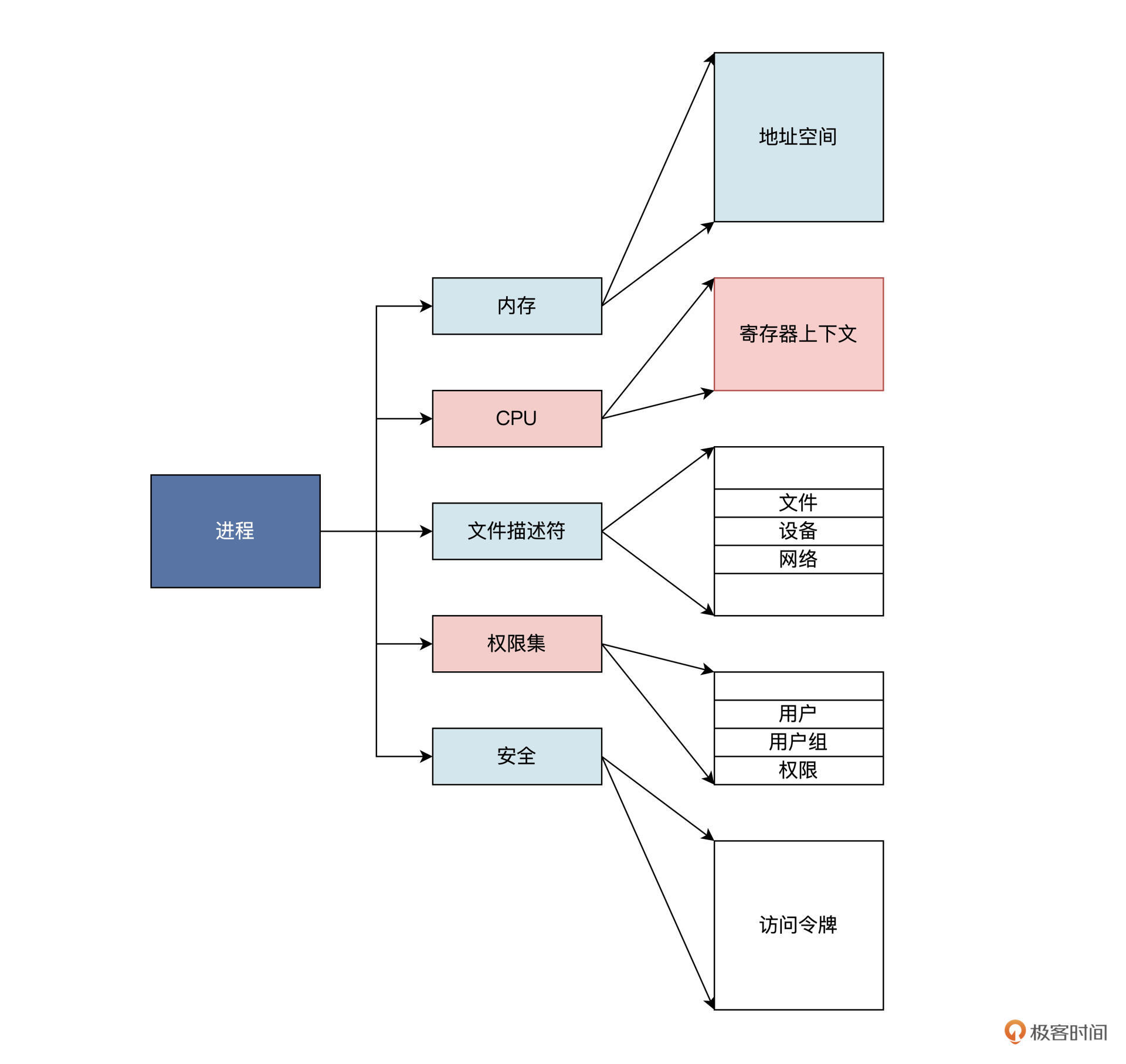你首先会想到,进程包含了什么。刚刚资源管理角度我们分析过,进程包含进程id(用于标识)、进程状态、地址空间(用于装载应用程序的代码和数据),还有堆和栈、CPU上下文(用于记录进程的执行过程)、文件描述表(用于记录进程使用了哪些资源,记住资源也可以抽象为文件)、权限、安全等信息。