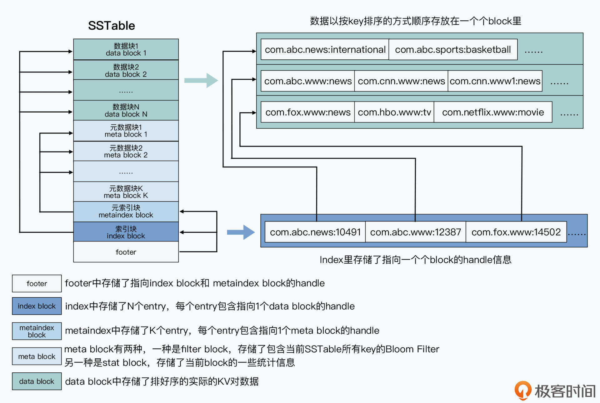 - 第二部分,则是一系列的元数据和索引信息,这其中包括用来快速过滤当前SSTable中不存在的行键的布隆过滤器,以及整个数据块的一些统计指标,这些数据我们称之为元数据块(meta block)。另外还有针对数据块和元数据块的索引(index),这些索引内容,则分别是元数据索引块(metaindex block)和数据索引块(index block)。