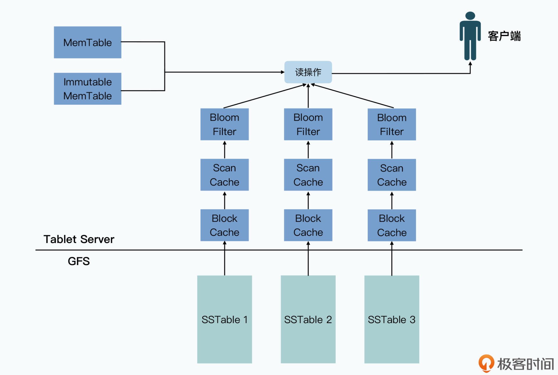 别着急,接下来我们就一起来看一看,Bigtable是怎么在尽可能减少随机读取的情况下,来访问数据的。