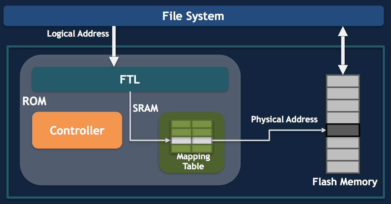 下图是闪存(Flash Memory)的结构图,其中比较重要的是FTL(Flash Translation Layer),它负责物理地址的分配和管理。它需要考虑到每个块的擦除寿命,将擦除次数均衡到所有块上去。当某个块空间不够的时候,它还要通过垃圾回收算法将数据迁移。FTL决定了闪存的使用寿命、性能和可靠性,是闪存技术中最为重要的核心技术之一。