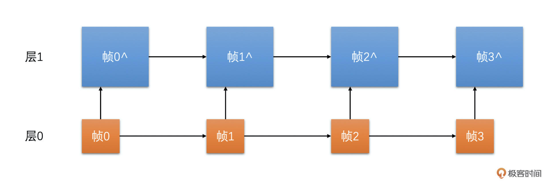 在图中,帧0是I帧不需要参考,且是第0层的帧。帧1是P帧,参考帧0,且是第1层的帧。帧2是P帧,参考帧0,不参考帧1,是第0层的帧。帧3是P帧,参考帧2,是第1层的帧。一直用这种模式不断地循环下去。