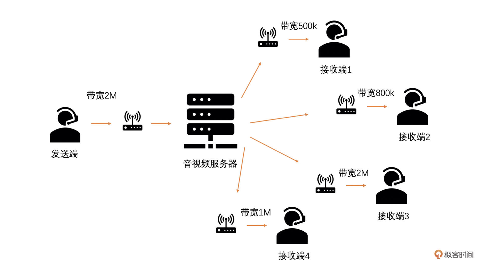 想象一下,现在有10个人参加视频会议,我是主持人,也是视频发送端。我们简化一下场景,我的画面需要发给其他的9个观众,而观众的画面不会发送给其他人。10个人都在自己的家里面办公,每个人的网络状况都不一样。有的人网络非常好,带宽有100M,而有的人网络非常差,只有500~600k,而且还因为使用无线网络丢包率很高。而我的网络比较中等,2M带宽,有线网络丢包率非常小。