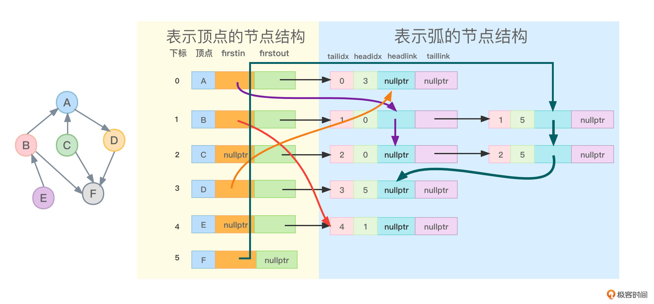 - 对于顶点F,没有指向任何弧,因此顶点F的firstout指针指向为nullptr。