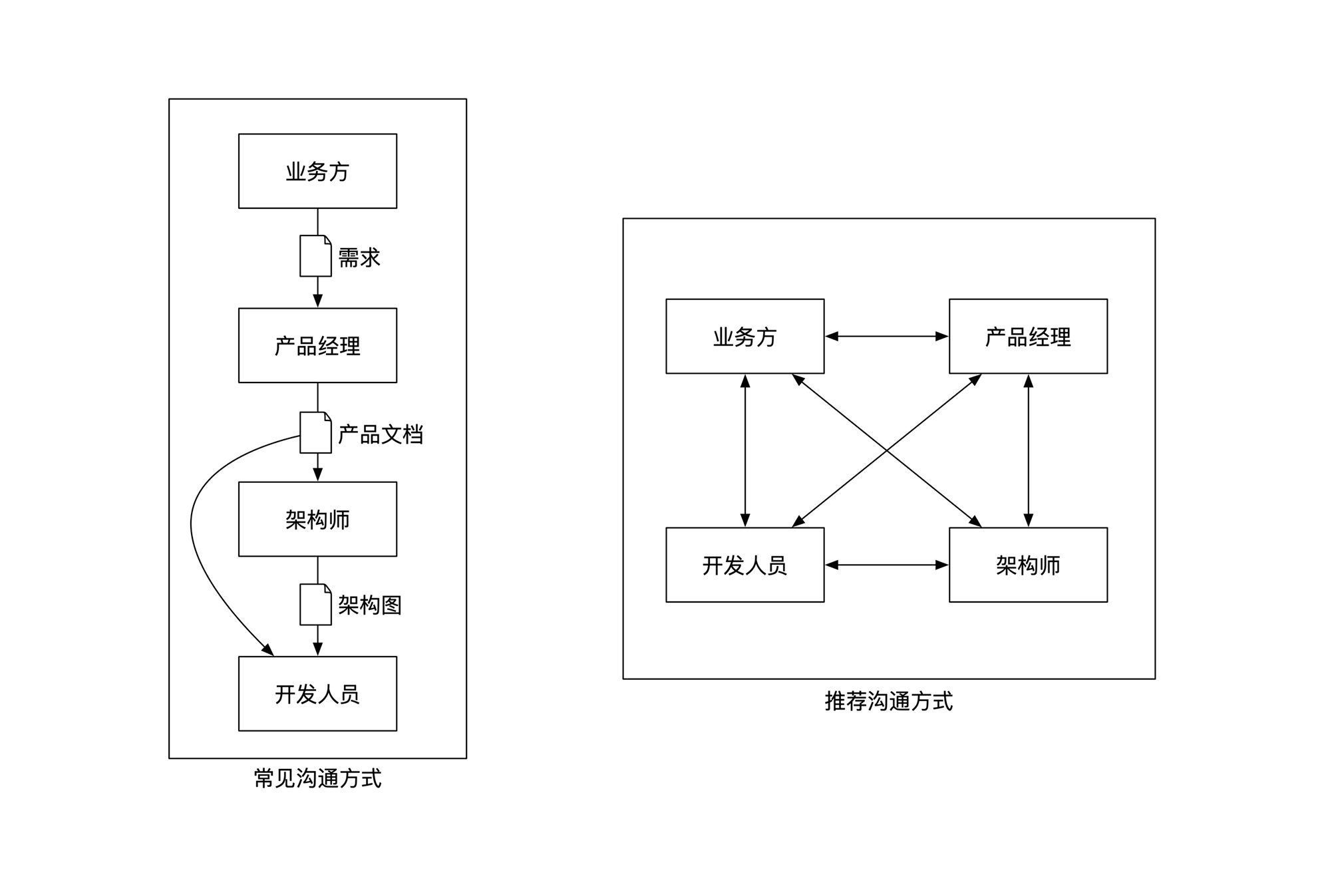 这个流程看上去很好,但是在实际操作中会有一些问题。比如当开发人员发现文档细节不够全面,甚至内容有误怎么办呢?这时候,沟通只能原路返回,等产品或者业务方再次确定清楚后,再从上往下传递消息。
