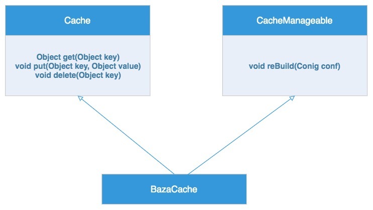 Cache实现类BazaCache(Baza是当时开发的统一缓存服务的产品名)同时实现Cache接口和CacheManageable接口,其中Cache接口提供标准的Cache服务方法,应用程序只需要依赖该接口。而CacheManageable接口则对外暴露reBuild()方法,使远程配置服务可以通过自己的本地代理调用这个方法,在运行期远程调整缓存服务的配置,使系统无需重新部署就可以热更新。