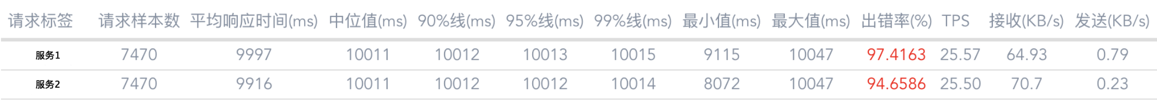 使用Flower开发的网关,实际压测效果如下,同样服务1响应延迟,出错率极高的情况下,通过Flower网关调用服务2完全不受影响。