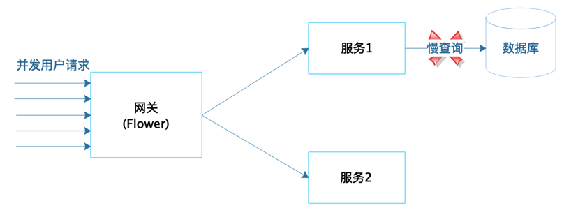 用户请求通过网关服务器调用微服务完成处理,那么当有某个微服务连接的数据库查询执行较慢时,如图中服务1,那么按照传统的线程阻塞模型,就会导致服务1的线程都被阻塞在这个慢查询的数据库操作上。同样的,网关线程也会阻塞在调用这个延迟比较厉害的服务1上。