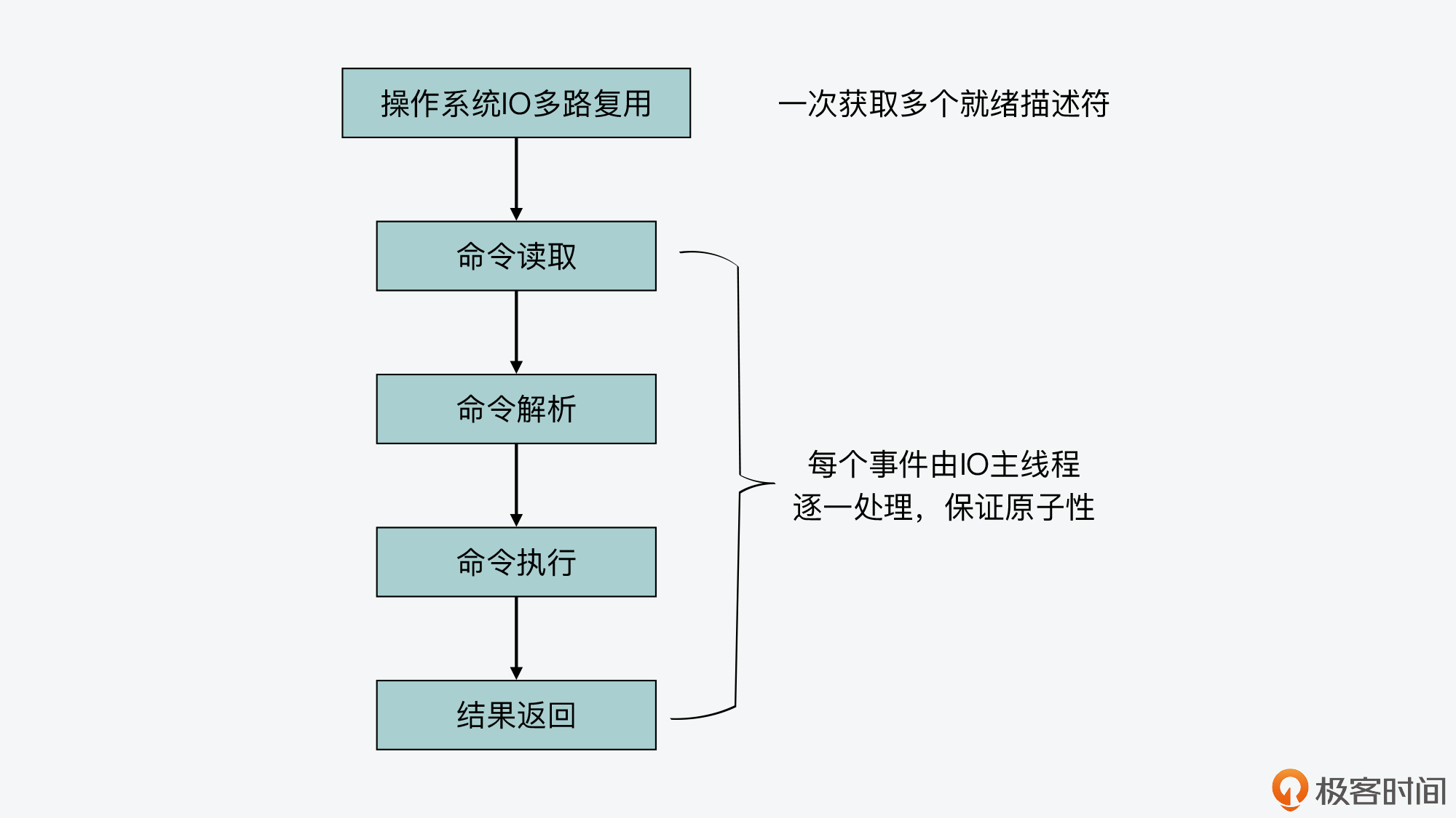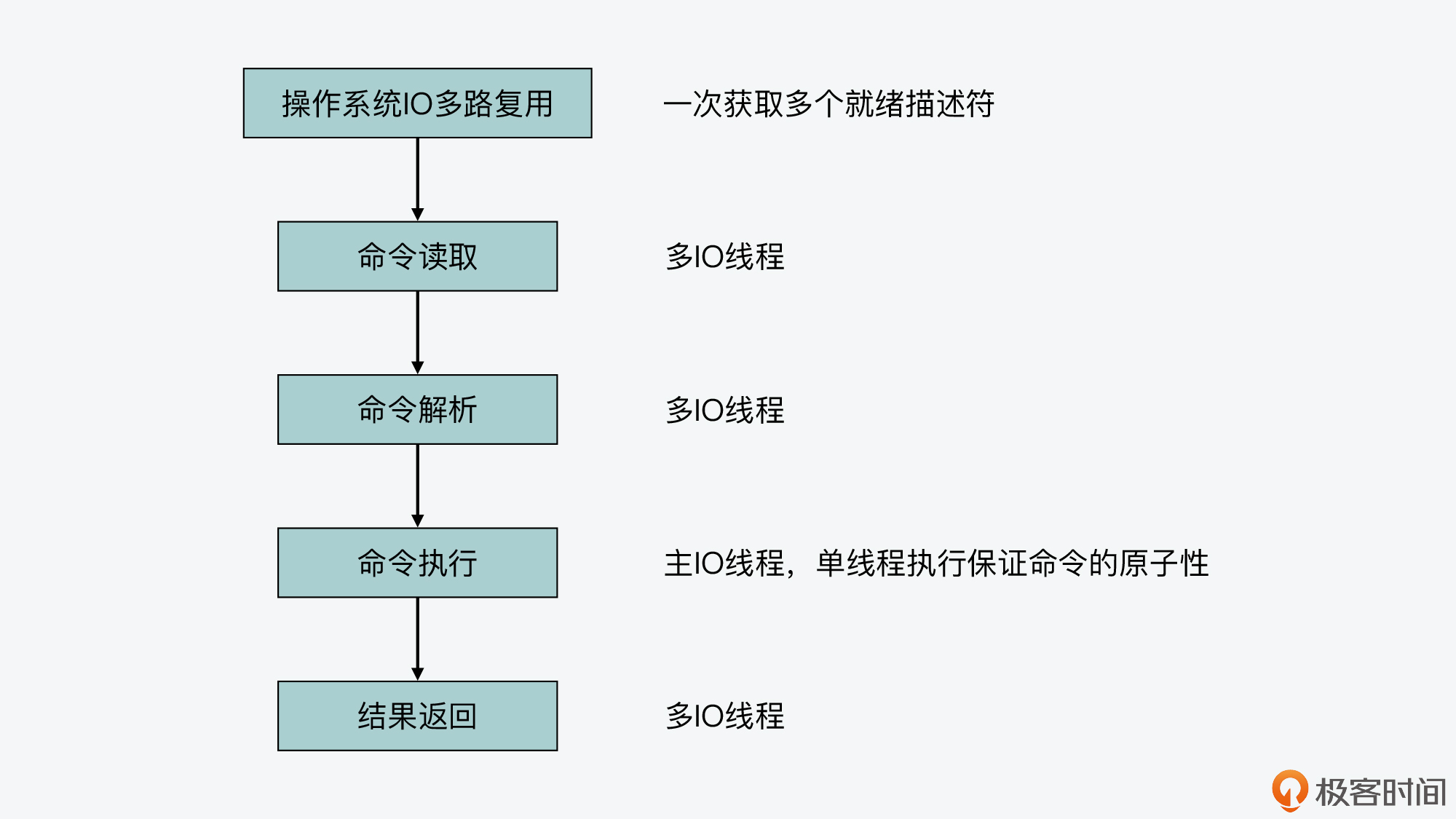 但是,如果这个处理过程配合上了我们前面介绍的IO多路复用机制和多IO线程机制,那么,这两个机制是在这个过程的什么阶段发挥作用的呢,以及会不会影响命令执行的原子性呢?